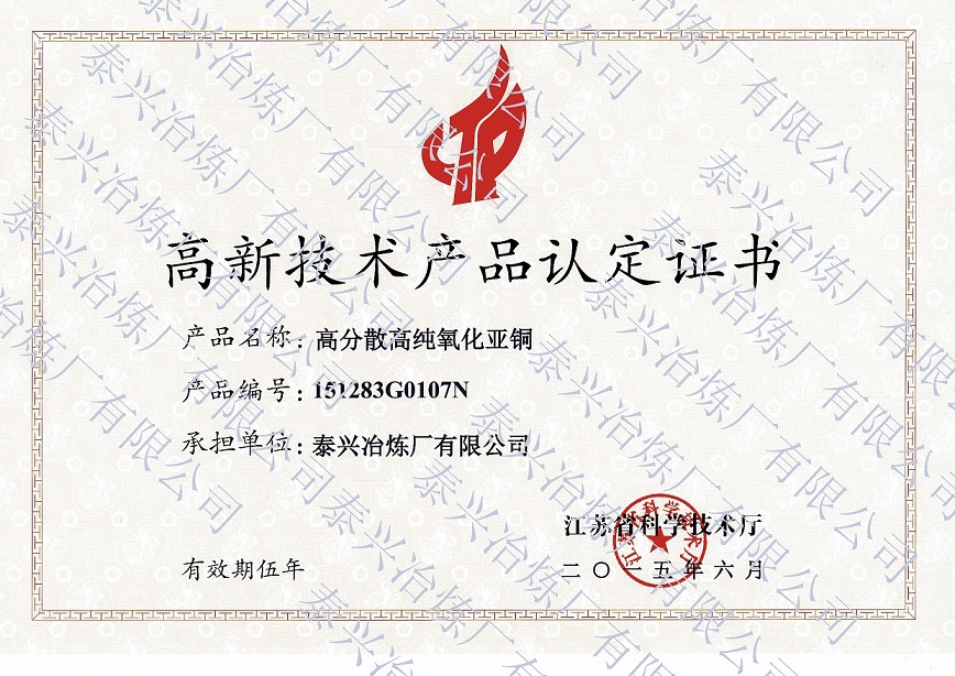 泰興冶煉廠有限公司(原泰興冶煉廠),始建于20世紀70年代初,現位于江蘇省泰興經濟開發區。歷經40年的創新驅動、穩健發展,已成長為一家專業生產堿式碳酸銅、高純電鍍氧化銅、氧化亞銅、氧化銅、無水硫酸銅、海綿銅粉及副產品聚氯化鋁(凈水劑)等系列無機鹽產品及處置不含氨的氯化銅蝕刻液(HW22)15000噸/年的“國家高新技術企業”和地方性骨干企業。公司總占地面積3.7萬平方米,建筑面積4萬平方米,注冊資本2088萬元,固定資產1.2億元,年產值約7億元。